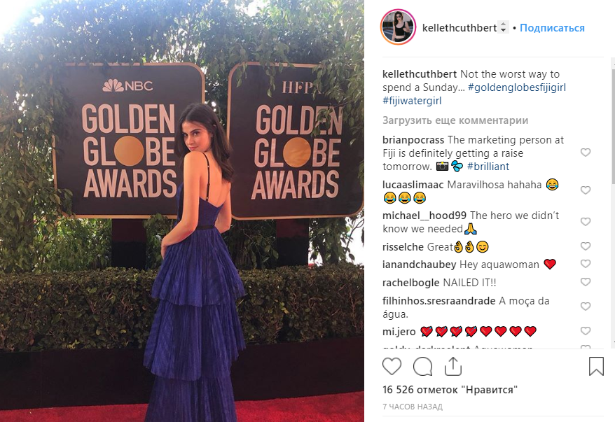 Западные таблоиды уже выяснили имя интернет-звезды: ею оказалась модель Келлет Катберт. В своем Instagram она также выложила фото с "Золотого глобуса", написав: "Не самый худший способ провести воскресенье".