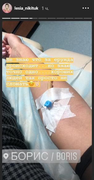 "Не знаю, что за ерунда происходит… но знаю точно одно: хороших людей так просто не сломать", - подписала Никитюк фотографию своей руки с капельницей.