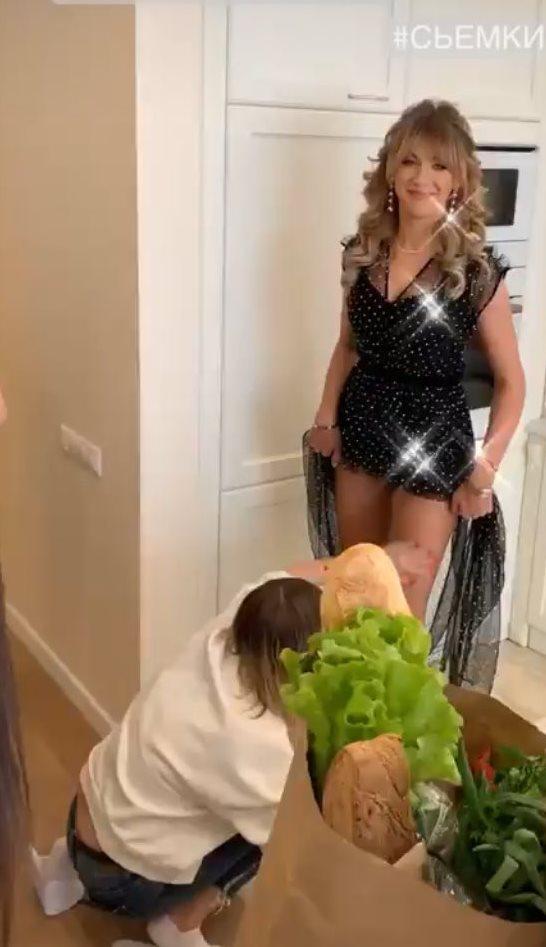 Никитюк позировала в черном полупрозрачном платье в горошек. Действо происходило на кухне, в руках телеведущая держала пакет с продуктами. Съемка проходила для журнала "Печерская ассамблея".