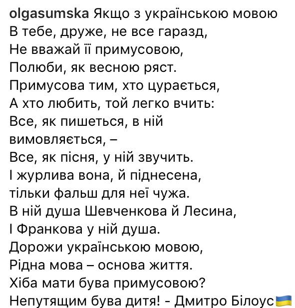 Подписчики Ольги в социальной сети заявили, что сама актриса общается на украинском языке только в обществе. А вне публичных мероприятий или студии говорит на русском. Актриса не оставила эти комментарии без внимания и ответила, что говорить на русском не является предосудительным, смысл поста в уважении к украинскому языку.