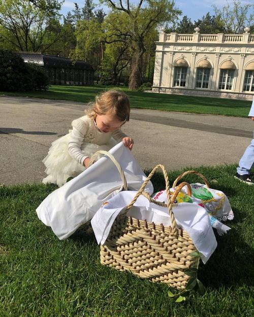 На Пасху телеведущая приготовила праздничную корзину с писанками и куличами и со своими родными посвятила все в церкви. Годовалая Евдокия решила помочь своей любимой маме, поправив продукты в корзинке возле храма.