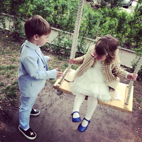 Также Ольга порадовала снимками маленьких шалунов, где они активно проводят время. На снимке двухлетний Валерочка в стильном костюме трепетно катает сестру на качелях.