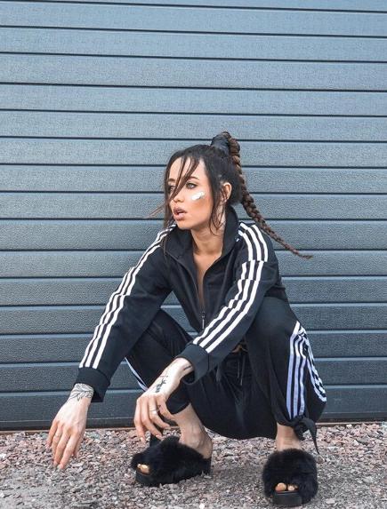 В своем Instagram певица опубликовала фото, на котором она сидит на корточках в черном спортивном костюме и тапочках с мехом, передает Час Пик.