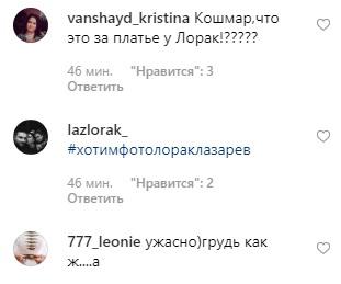 "Слишком откровенное декольте""Аж противно", "Что то наряды?! С каждым разом все пошлее", "Как это платье держится", "Главное, не потерять платье, на самом интересном месте", "А почему вы всегда оголяете грудь", "Кошмар, что это за платье у Лорак", "Ужасно. Грудь как ж**а".