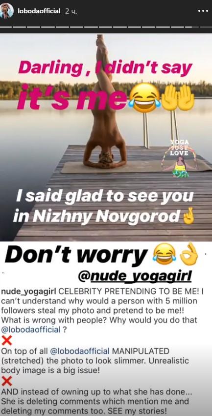 После того, как стало известно о краже частного фото, Лобода заблокировала некоторых пользователей в сети и удалила негативные комментарии и обвинения, в том числе и от самого автора снимка. После волны возмущений Светлана Лобода решила "улучшить" ситуацию и оправдать себя. Для этого она насмешливо обратилась к блогеру в Instagram-Stories.