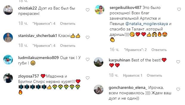 "Мадонна и Бритни Спирс нервно курят!!!", "Дуэт из Вас был бы прекрасен!", "Оце так! У губи!", "Ирочка, всем понравилось )))) Ждем ваш дуэт и не один))", "Класні", "Это было роскошно! Всех благ замечательной Артистке и Певице @natalia_mogilevskaya и спасибо за Талант, который даришь!)))".