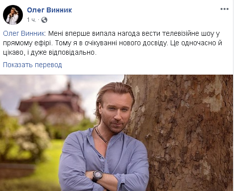 "Мне впервые выпала возможность вести телевизионное шоу в прямом эфире. Поэтому я в ожидании нового опыта. Это одновременно и интересно, и очень ответственно", - прокомментировал Винник свое участие в шоу в Facebook, передает Час Пик.