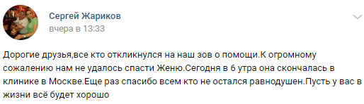 Как сообщил в соцсети ее муж, капитан команды Сергей Жариков, Евгения скончалась в 6 часов утра 7 октября в московской клинике.