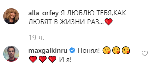 На своей странице Алла Борисовна выложила селфи, под которым подписала: "Я люблю тебя, как любят в жизни раз". Ее муж Максим Галкин в комментариях ответил на признание: "Понял! И я!".