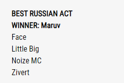 Среди номинантов на звание "лучшего российского исполнителя" были такие артисты, как Face, Little Big, Noize MC, Zivert. Но победа досталась украинке Марув.