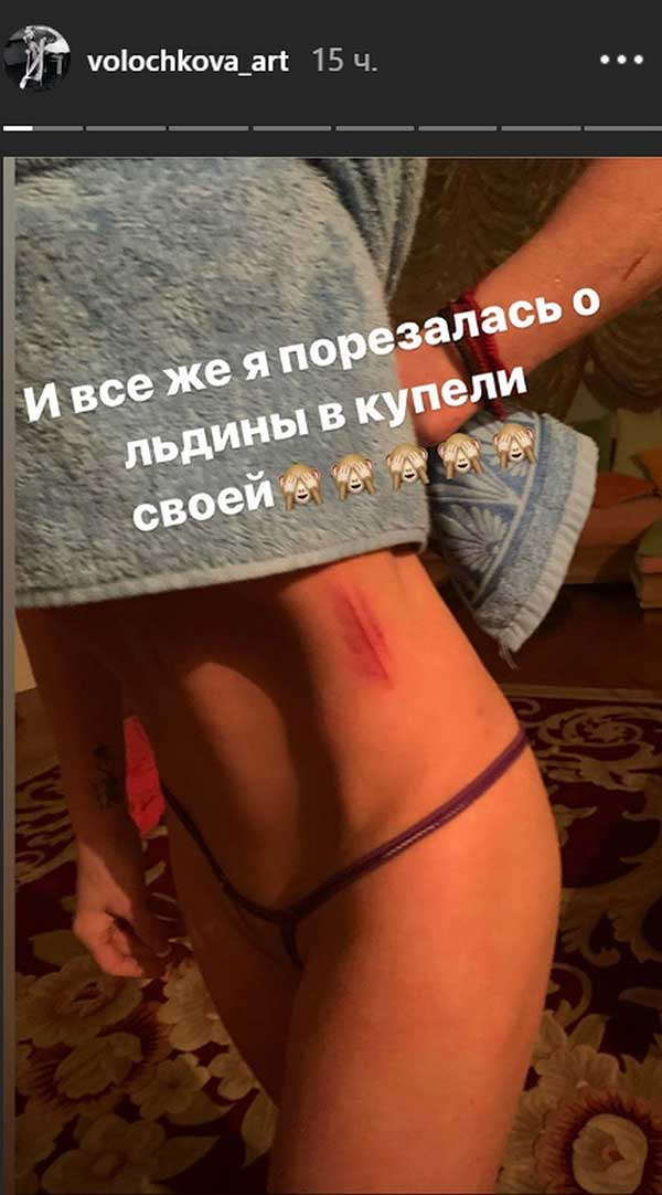Волочкова позировала как всегда - в микротрусах, обмотавшись полотенцем. На фото видно, что на боку у артистки красуется большая ссадина.