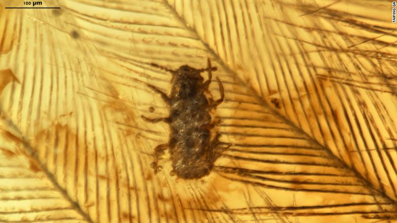 Десять насекомых, похожих на вшей, достаточно хорошо сохранились в двух кусках янтаря вместе с двумя перьями динозавра. Находка была обнаружена в северной провинции Мьянмы Качин, ее возраст - около 100 миллионов лет.