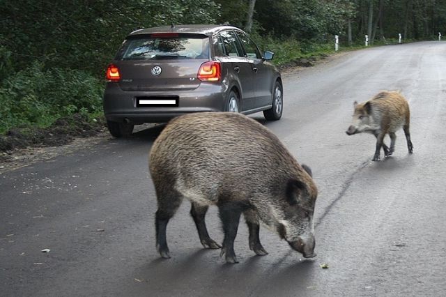В конце, пути автомобиля и дикого кабана разошлись. Автомобиль и дальше поехал по дороге, а кабан-победитель бодро рванул к придорожным зарослям, в которых и исчез.