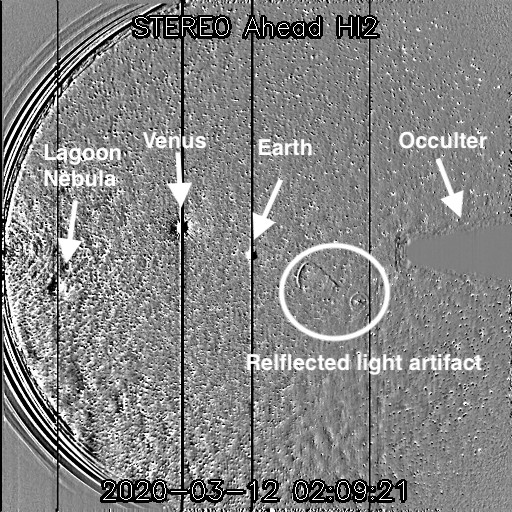 Миссия Stereo была запущена в 2006 году для изучения выбросов Солнца и корональной массы. Один из аппаратовпо-прежнему работает, его телескоп HI2 недавно сделал серию фотографий Венеры и Земли.