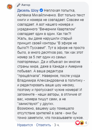 Как сообщал Час Пик, в "Дизель Шоу" сообщили, что номер "Квартала 95", вышедший в 2020 году, очень напоминает сценку, которую показывали "Дизель Шоу" в 2015-м.