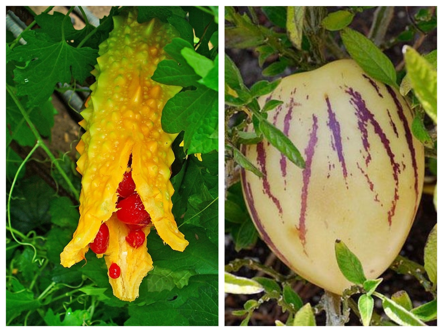 Родина этого растения - юго-восточная Азия, но его успешно выращивают и в наших краях. Плоды момордики необычной формы, похожи на бородавчатый огурец. В пищу употребляют не только их, но еще и молодые листья и побеги, которые добавляют в супы и салаты. Также момордика широко применяется как лекарственное растение.