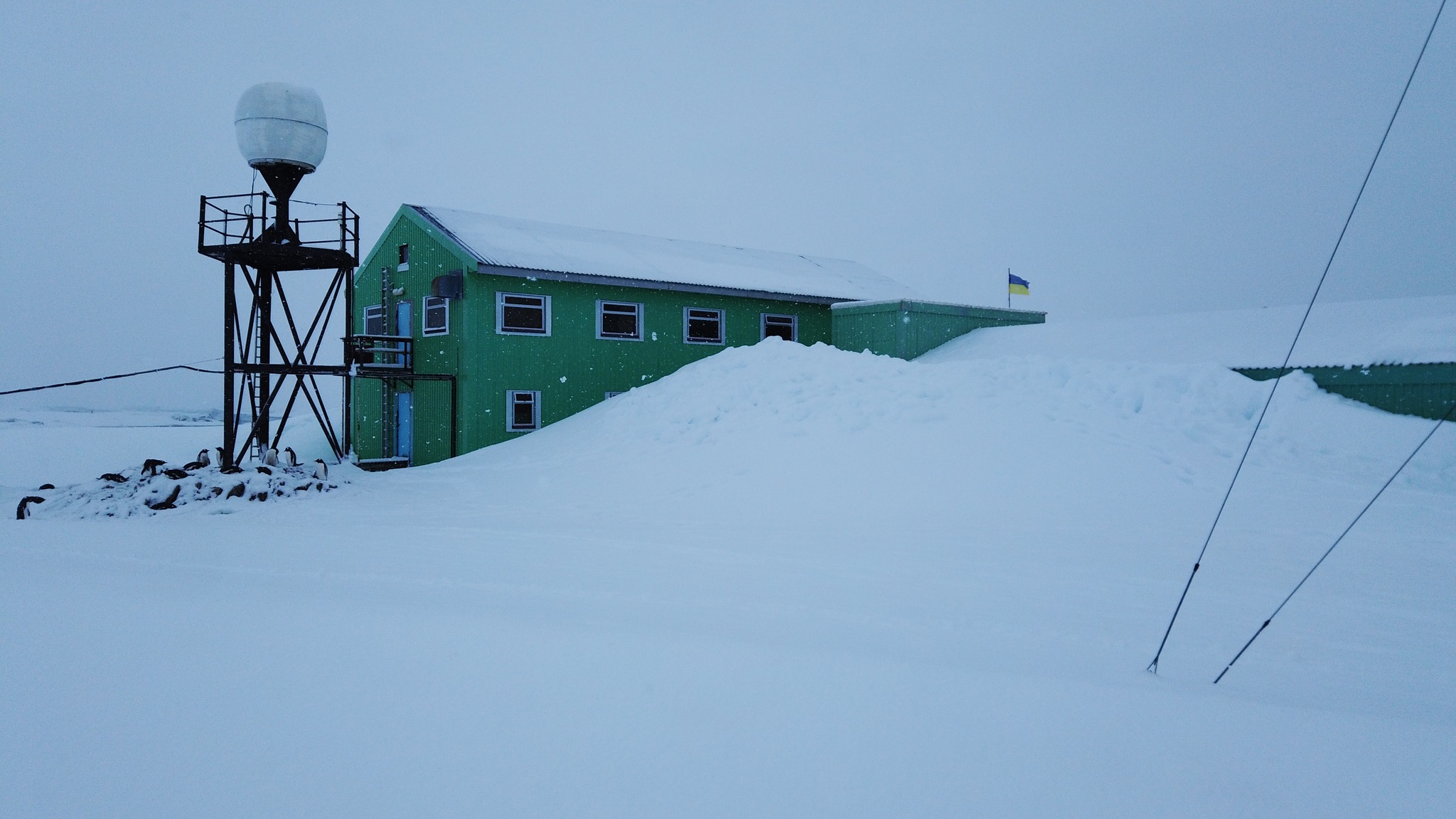 Еще неделю назад сообщалось, что возле станции "Академик Вернадский" выпало 262 см снега. Гнезда пингвинов, расположенные в низменностях, полностью засыпало : из-под снега торчат только головы птиц.