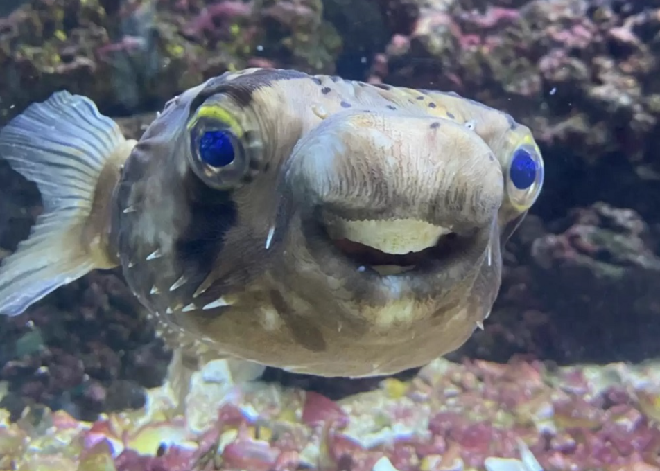 Рыба фугу имеет особое строение зубов - по сути у нее один сросшийся зуб, который постоянно растет. В естественной среде рыбка вовремя стирает свой зуб о раковины, из которых добывает моллюсков для пропитания.