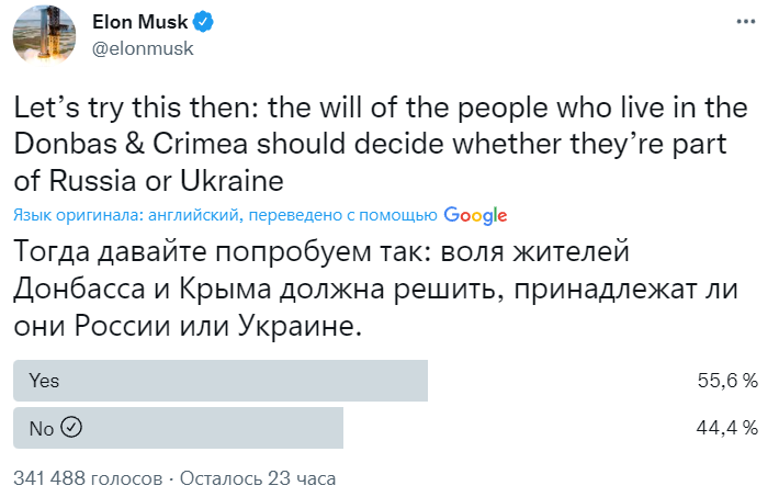 Но Маску, по всей видимости, масштаб скандала показался недостаточным, и он опубликовал еще один твит с опросом, должны ли жители Крыма и Донбасса решить, являются ли они частью России или Украины.