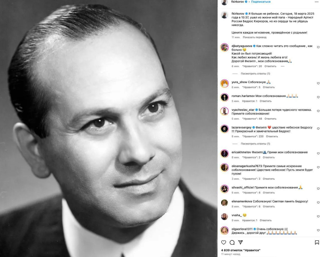 "Я больше не ребенок. Сегодня, 18 марта 2025 года, в 15:37 ушел из жизни мой отец – народный артист России Бедрос Киркоров. Но из сердца не уйдешь никогда", – написал артист.