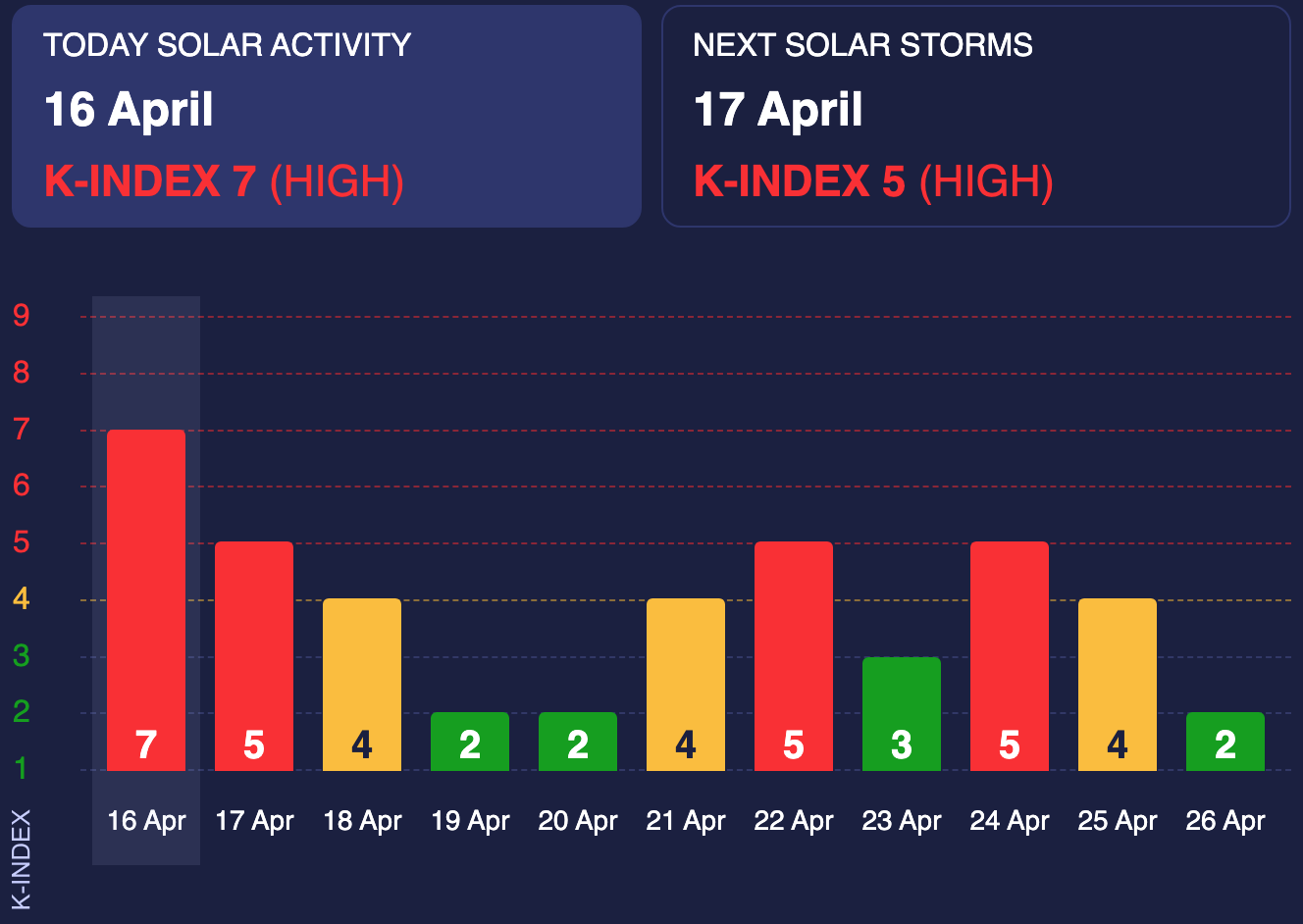 Сегодня, 16 апреля, К-индекс магнитной бури достигнет 7, что соответствует красному уровню опасности. Днем ранее К-индекс достигал 8. Это очень ощутимые значения не только для метеозависимых людей.