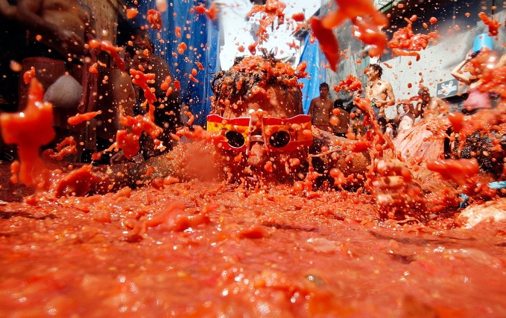 В испанском городе Буньоль близ Валенсии в 76 раз состоялась "Ла Томатина" - самая большая помидорная битва в мире. В этом году зрелище собрало 20 тысяч участников, многие из которых приехали издалека. За час томатной битвы в городе было использовано 150 тонн спелых грушевидных помидоров — очень зрелых, чтобы не причинять участникам боли.