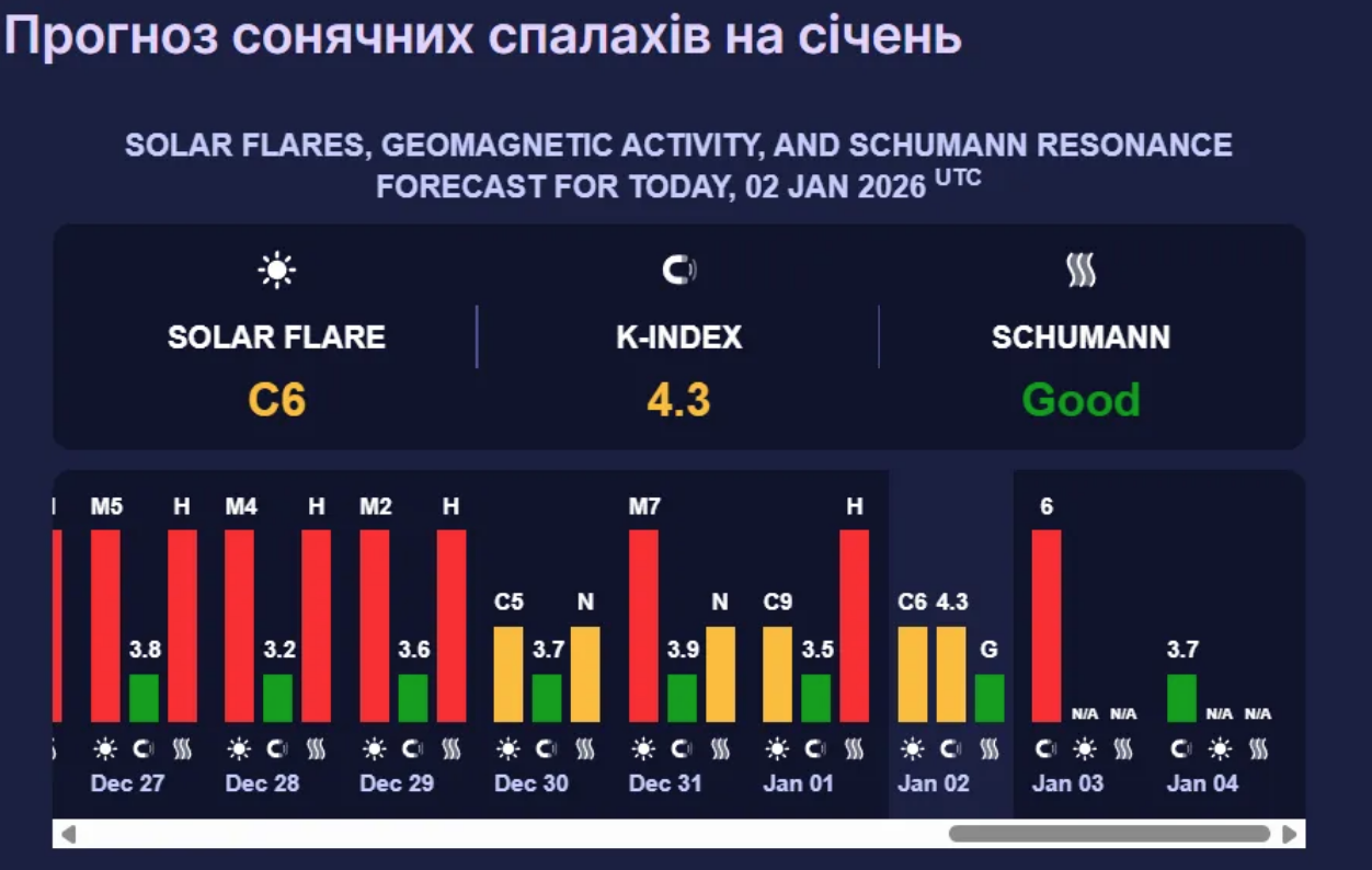 По состоянию на 2 января магнитосфера Земли находится на грани стабильности. Уровень геомагнитной активности по К-индексу колеблется в пределах 4 баллов, что соответствует слабым возмущениям и обычно не ощущается большинством людей.